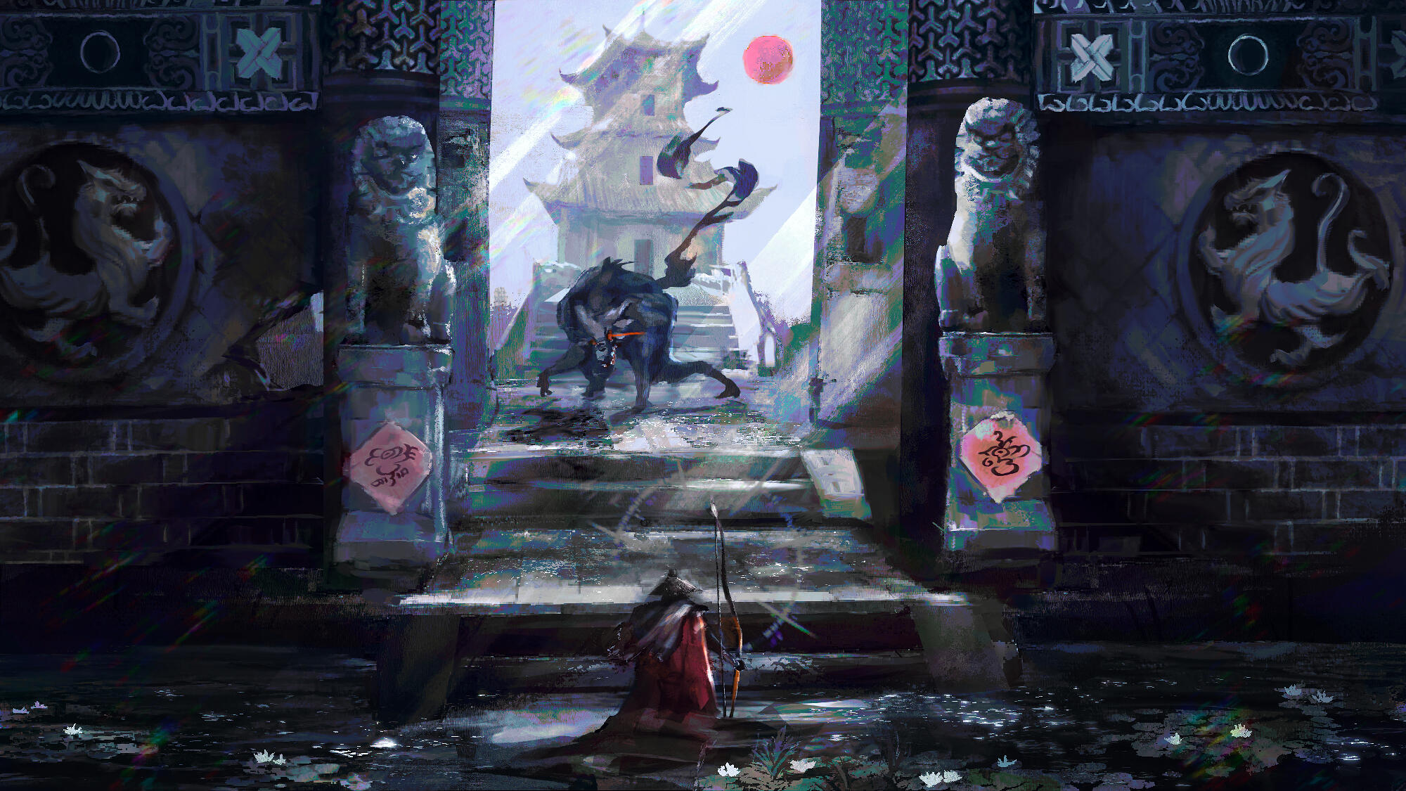 Hou Yi at the gates of the Lotus Temple, facing the Tian Gou, a hungry beast created to devour the moon.